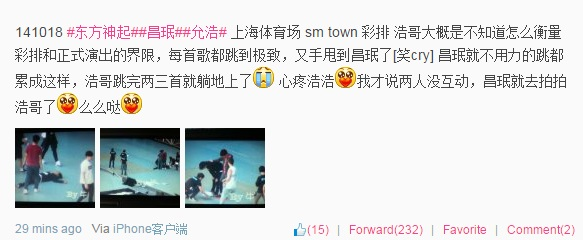 141018 Shanghai Sport Stadium SM Town Rehearsal, Yunho probably didn’t know what are the (requirements) boundaries of rehearsal and actual performance. He was going full force in each dance (during the rehearsal), and he even (accidentally) fling/swing his hand at Changmin. Changmin already looks that tired eventhough he didn’t go full force. After yunho danced to two to three songs, he lied down on the floor *cries* heartache for Yunho *love you* and I was about to say there isn’t much interaction between the two, then Min went and gave Yunho a pat on his back… *love you*