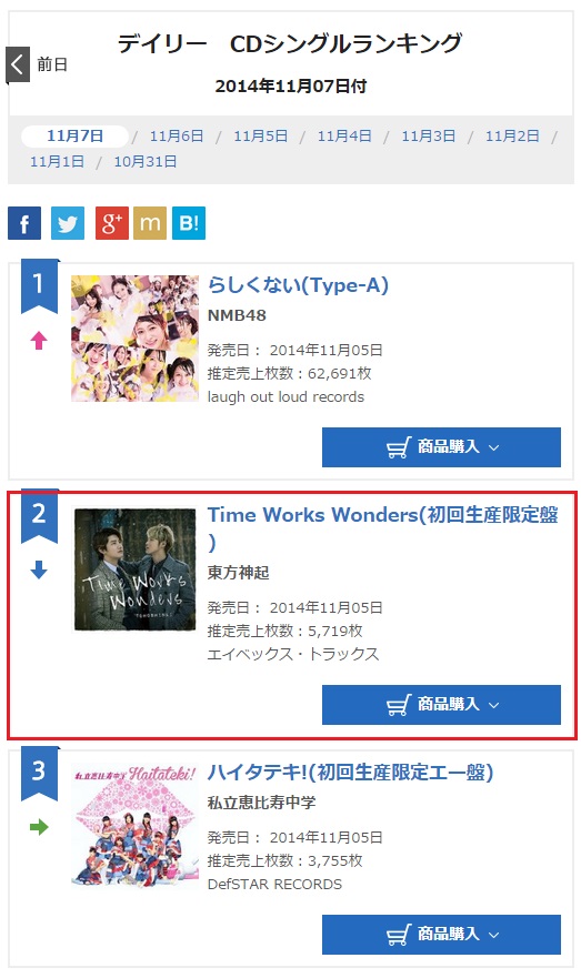 141108 Oricon Daily Single Ranking (for 141107) : #2 Tohoshinki – Time Works Wonders with 5,719 copies, Total: 99,923 copies!