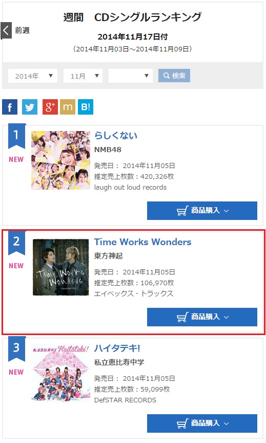 Oricon Weekly Single Ranking (for 141103~09): No.2 Tohoshinki – Time Works Wonders with 106,970 copies!