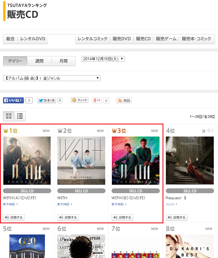 Daily CD sales ranking for 141216: No.1 Tohoshinki – WITH ( A ver), No.2 Tohoshinki – WITH ( C ver), No.3 Tohoshinki – WITH ( B ver)