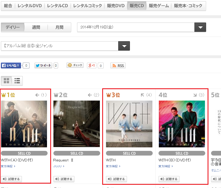Daily CD sales ranking for 141219: No.1Tohoshinki – WITH ( A ver), No.3 Tohoshinki – WITH ( C ver), No.4 Tohoshinki – WITH ( B ver)
