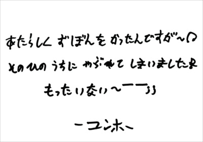 I bought a new pair of pants, but on that day itself, it was torn. What a waste~ – -”