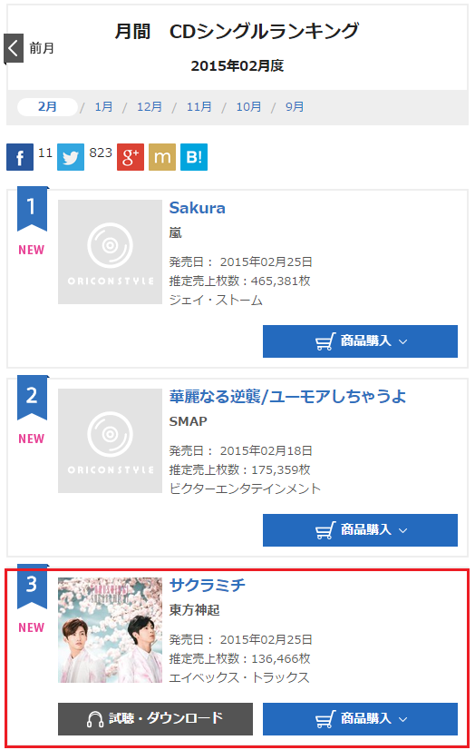 Oricon Monthly Single Ranking for February: No.3 Tohoshinki – SAKURAMICHI, with 136,466 Copies~