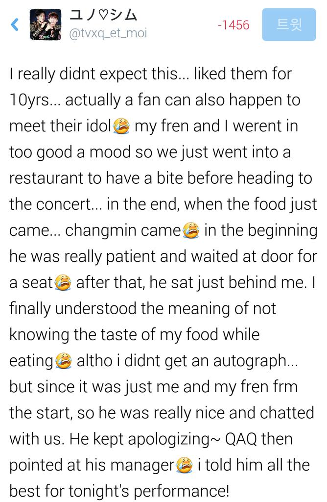 These are fanaccounts of two chinese fans on 150502 PDT (Shared ob 150503 KST), we will only share their translated fanaccounts on their encounter with Changmin and staff in a Vietnamese restaurant called “PHO 24” in LA, that Yunho happened to visit yesterday as well.