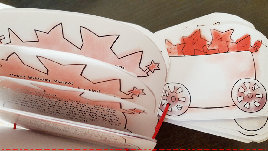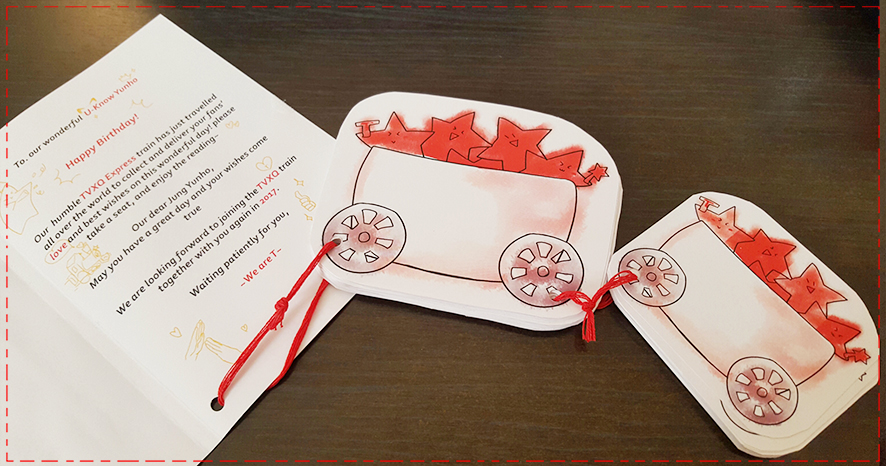 Below, we took some photos of the card’s final look! The card symbolizes our TVXQ Express train! It consists of a main card, the train’s engine with Yunho, which also serves as the container for the rest of the card, and then a chain of strings of smaller sets of cars that carry the fans messages~♥