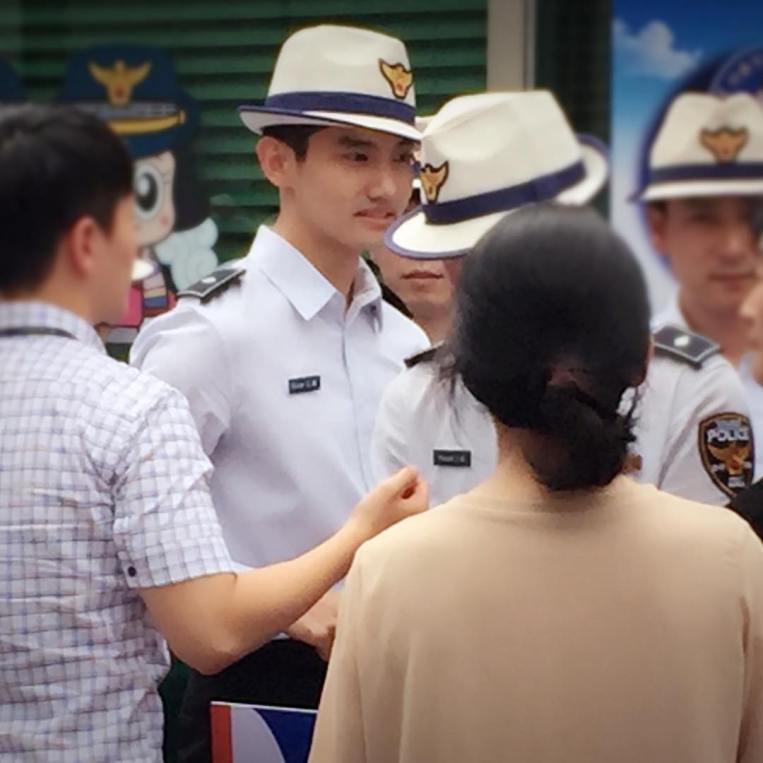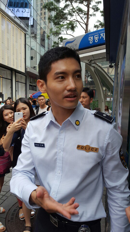 Check out handsome policeman Shim C. M. , as his name tag displays, personally distributing tourist police brochures (more about them here) to some lucky fans who were around at Myeongdong in Seoul~