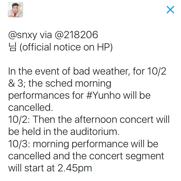 - Yunho for 10/2 if there is bad weather, the event will be moved to the auditorium & shuttle buses will be used to ferry ppl. this isn’t the auditorium used for events but the one inside the army compound. [cr: @218206]