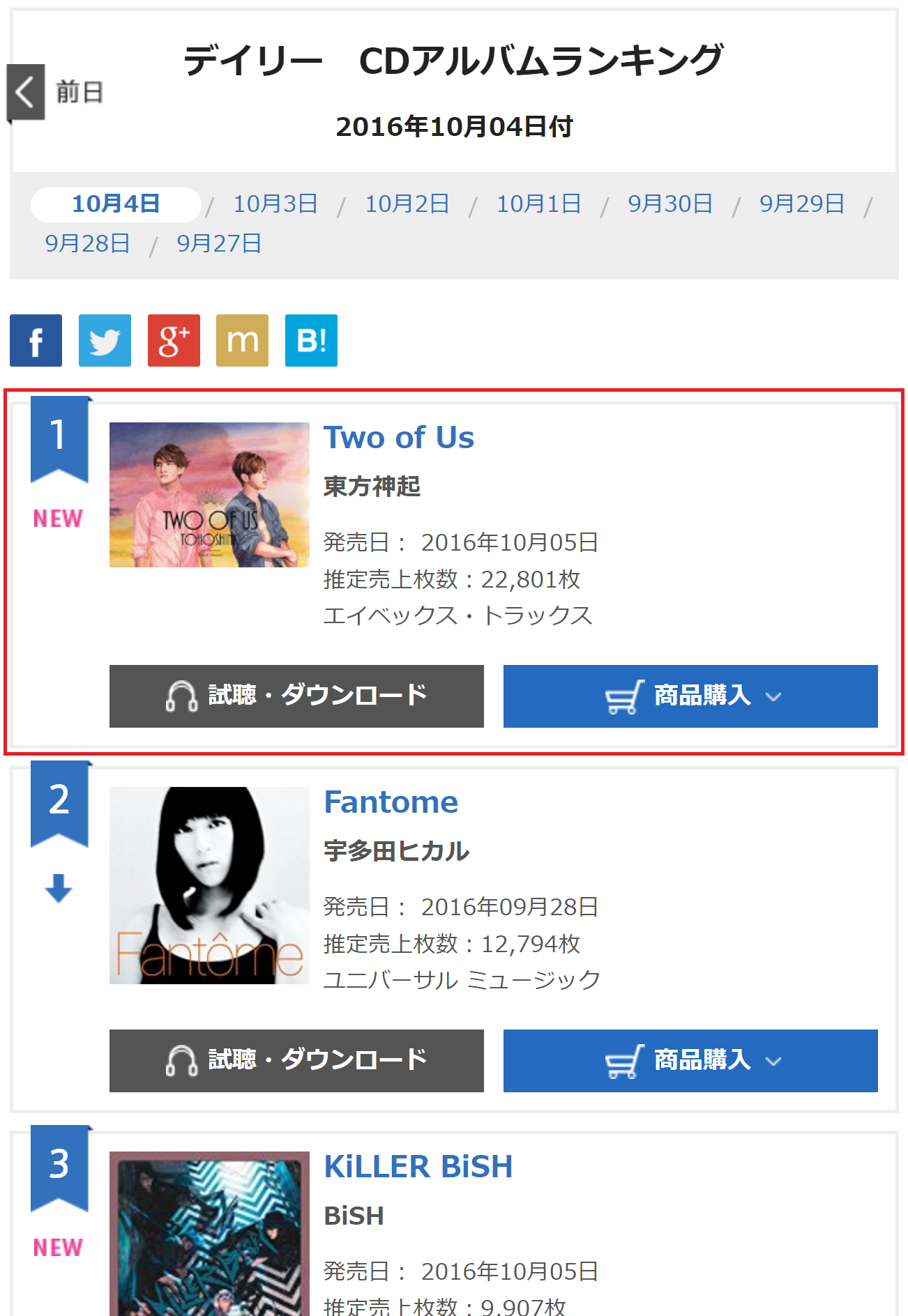 Daily Album overall sales ranking in Tower Records stores for 161004: No.1 Tohoshinki – Two of Us~