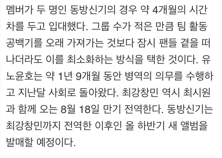 In the case of the duo group, TVXQ, they enlisted within 4 months of each other. Even as the number of members are small, rather than let the hiatus from group activities go on for long, they chose the method that would allow them to minimise the hiatus, and left the side of fans temporarily.