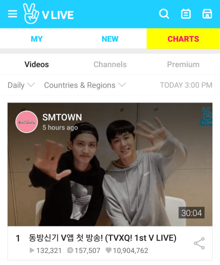 The first ever TVXQ! V LIVE broadcast on the 20th topped the daily ranking for the 20th and 21st in the all countries chart.