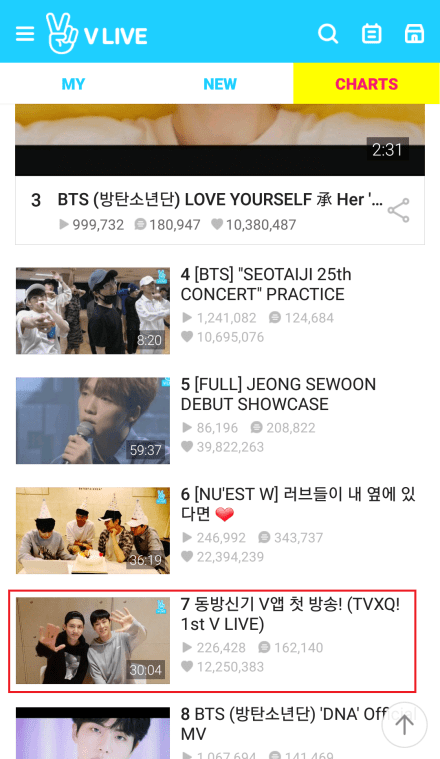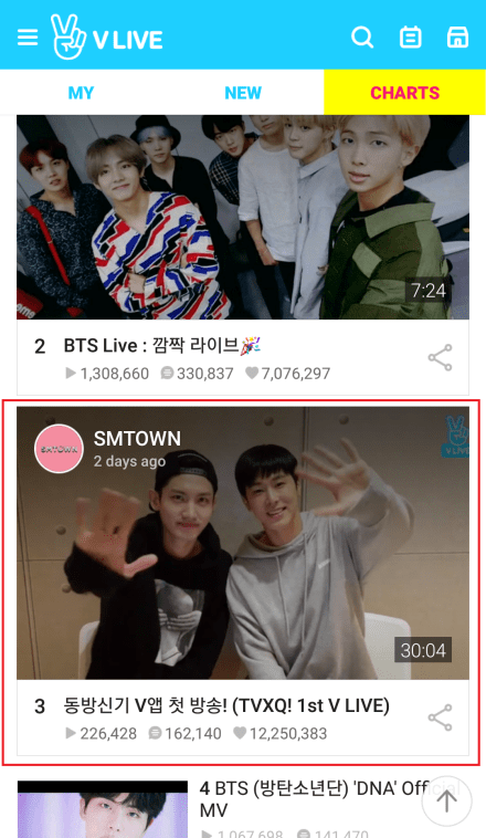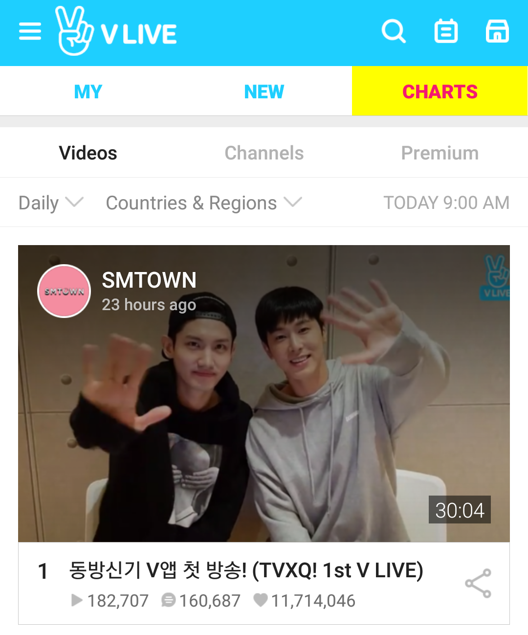 The first ever TVXQ! V LIVE broadcast on the 20th topped the daily ranking for the 20th and 21st in the all countries chart.