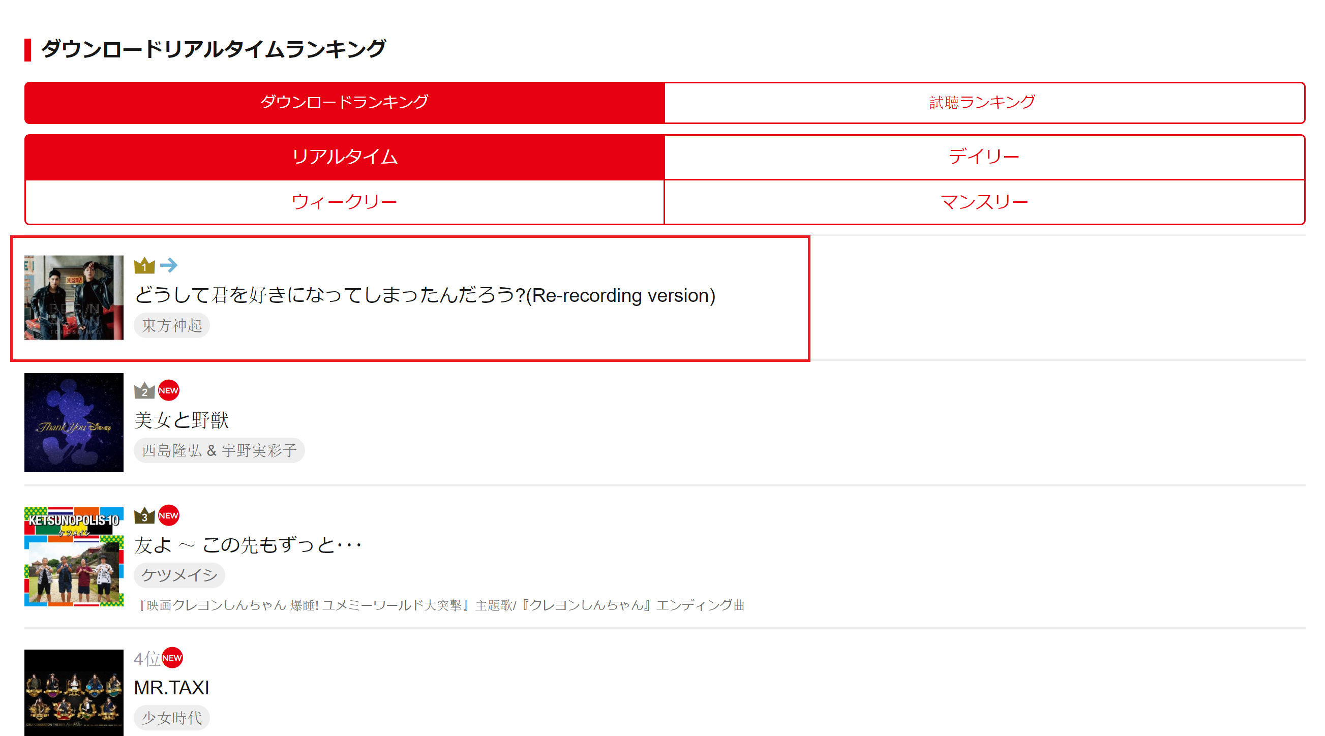 Tohoshinki’s “Doushite Kimi Wo Suki Ni Natte Shimattandarou? (Re-recording version)” topped mu-mo’s daily downloads chart! Choosey Lover (WITH Tour version) entered the chart as well~