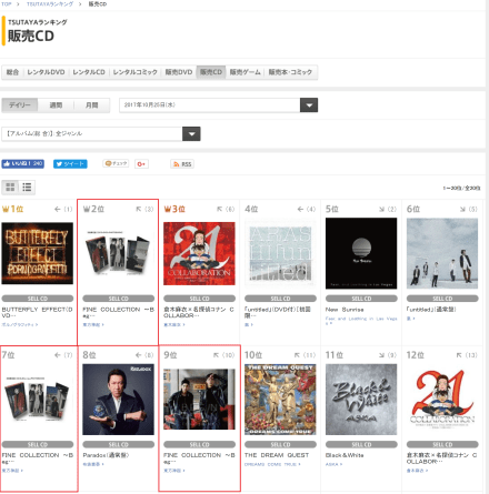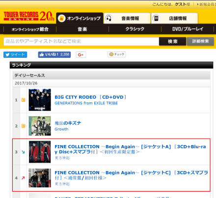 東方神起 Album「FINE COLLECTION~Begin Again~」topped the overall album sales for Tower Record stores for 10/24 and 10/26 (2nd on 10/25), and TSUTAYA records tweeted on the album to top their weekly album sales chart~