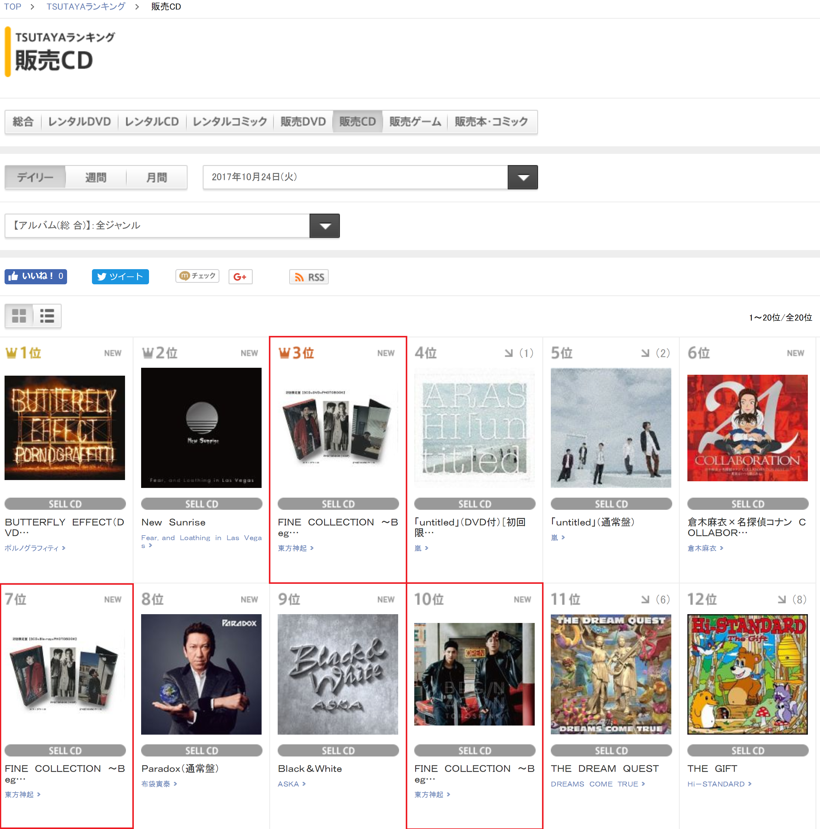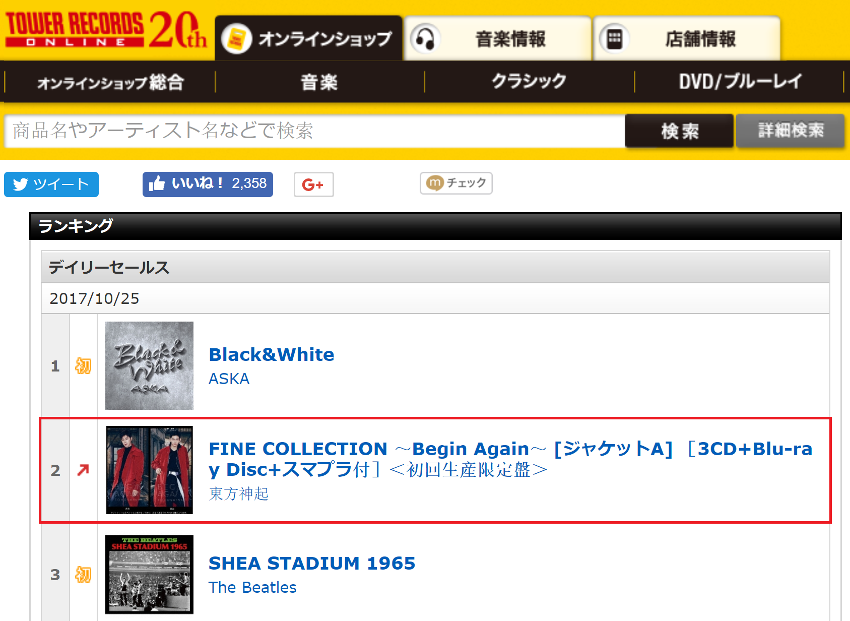 東方神起 Album「FINE COLLECTION~Begin Again~」topped the overall album sales for Tower Record stores for 10/24 and 10/26 (2nd on 10/25), and TSUTAYA records tweeted on the album to top their weekly album sales chart~