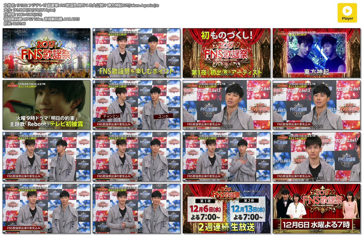 The 2017 FNS Music Festival highlights (Fuji TV’s “超豪華!FNS歌謡祭 見どころ大公開SP”) was broadcast on 171202 at 25:15~25:25 JST (i.e. 171203 at 01:15~01:25 JST), featuring extended Tohoshinki comment.