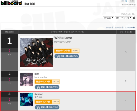 For the week of 2018/1/1, 東方神起 Reboot came 2nd for Billboard Japan Weekly chart for Top Singles Sales! In addition, Reboot and Begin topped the Billboard Japan Hot 100 Twitter ranking thanks to Bigeasts being active there, with Reboot ranking in Top 3 for Hot 100 overall, in 5 for Download songs~