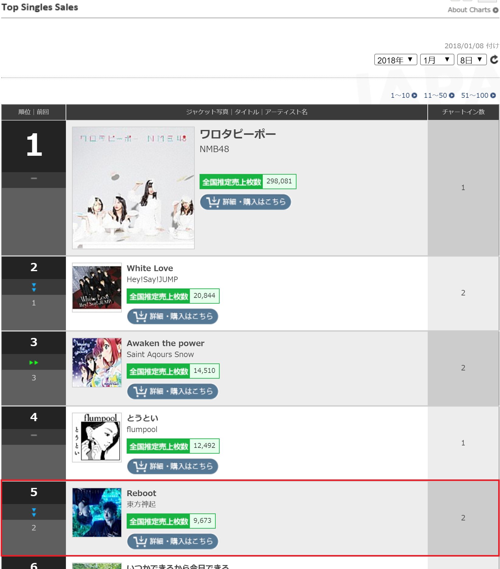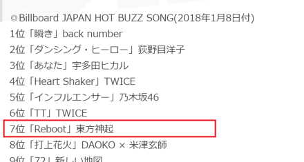 For the week of 2018/1/8, 東方神起 Reboot and Begin topped the Billboard Japan Hot 100 Twitter ranking once again thanks to Bigeasts, with Reboot ranking in Top 5 for Hot 100 overall, and the Reboot single on 5th for Billboard Japan Weekly chart for Top Singles Sales.
