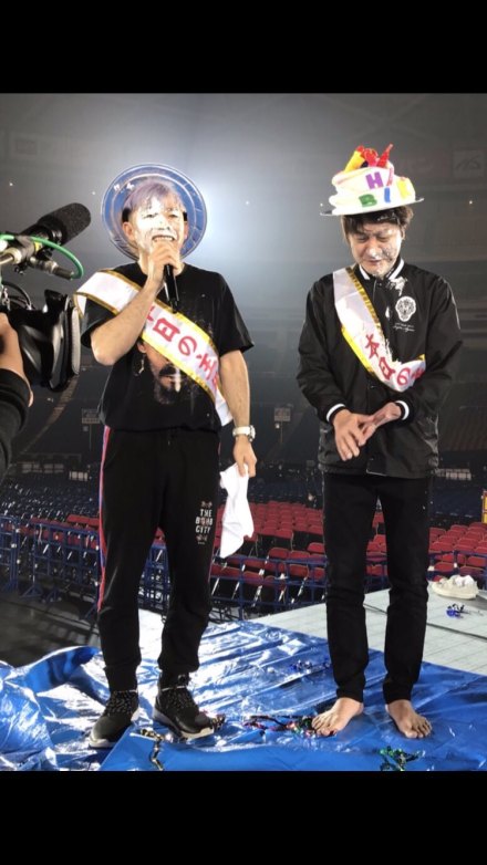 Today Tohoshinki along with the Toho team staff celebrated three birthdays at the dome before today’s live! our boys smashing their faces with their cakes, Happy birthday~ > w <