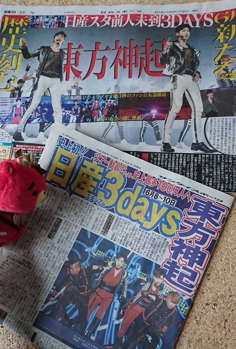 Headlines (top: Nikkan Sports; bottom Sankei Sports) on Tohoshinki’s upcoming historic 2nd time at Nissan Stadium with 3 concerts. (just 70,000 people a day would = more than 200,000 people mobilised. P.S: record of 144,000 ppl in 2013)