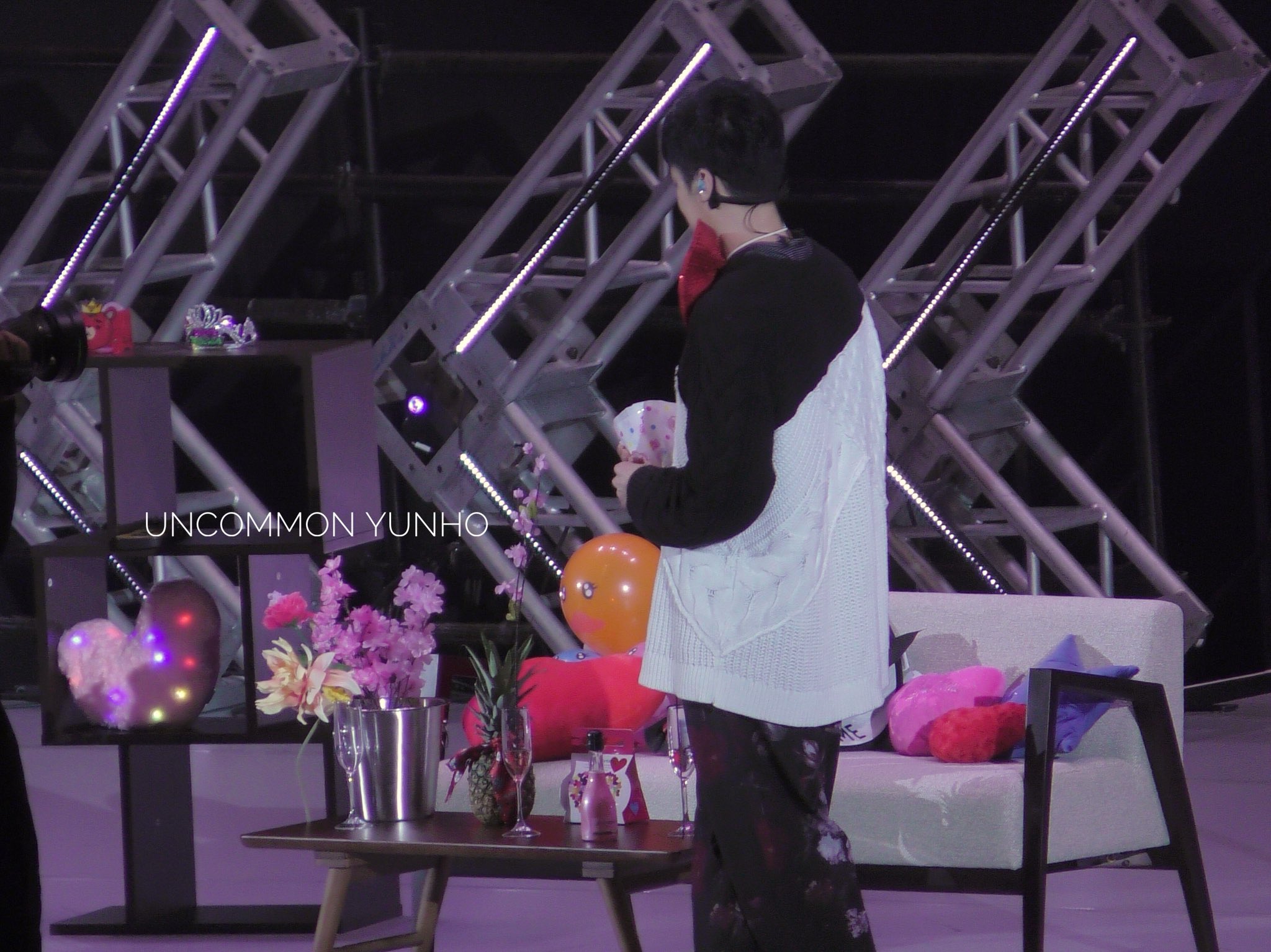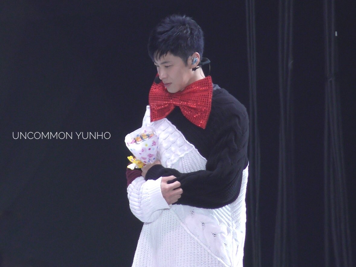 - 3/14 as it was White Day and the mission was to coordinate a room for one’s girlfriend, Yunho explained his concept was for a “romantic me (himself)” present so he placed a red bow on his neck and walked towards Changminㅋㅋㅋ [cr: @labenjamine]