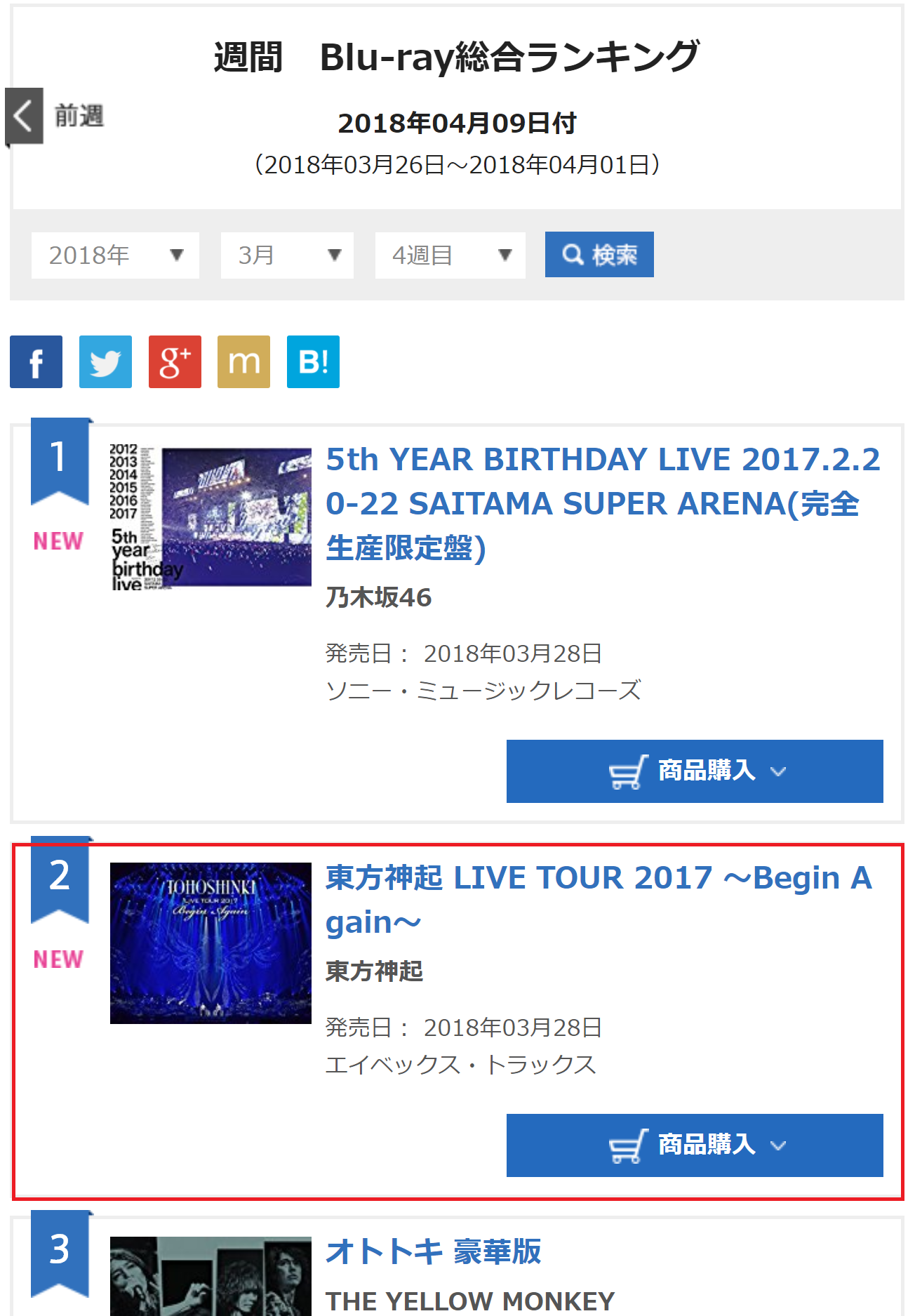 - Oricon Weekly Overall Blu-ray Sales for 4/9 (180326 to 180401): No.2 東方神起 LIVE TOUR 2017 ~Begin Again~