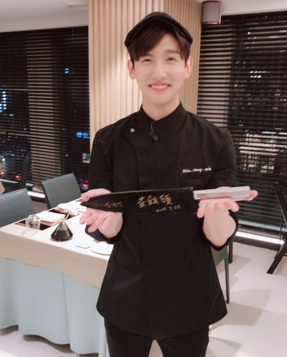 Changmin’s selfie with one of the chefs from his 72 hours filming, and him proudly holding his Chef knife gift~