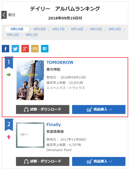 - 180921 Oricon Daily Album Ranking (for 180920): No.1 Tohoshinki – TOMORROW, with 15,011 Copies, Total is 114,868 Copies!