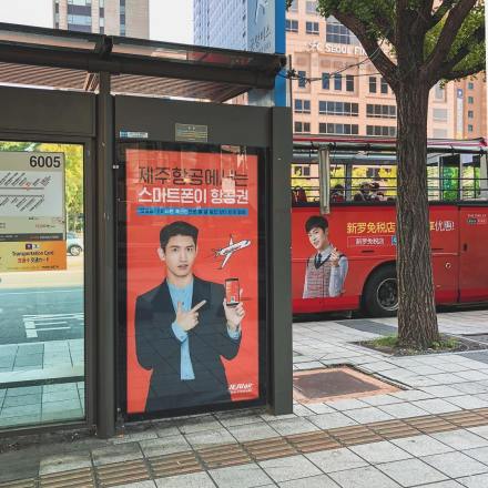 With some perfect timing, some managed to spot a bus featuring a chinese shilla duty free ad with Yunho at the same place where an airport bus stop has an ad of JEJUair featuring Changmin