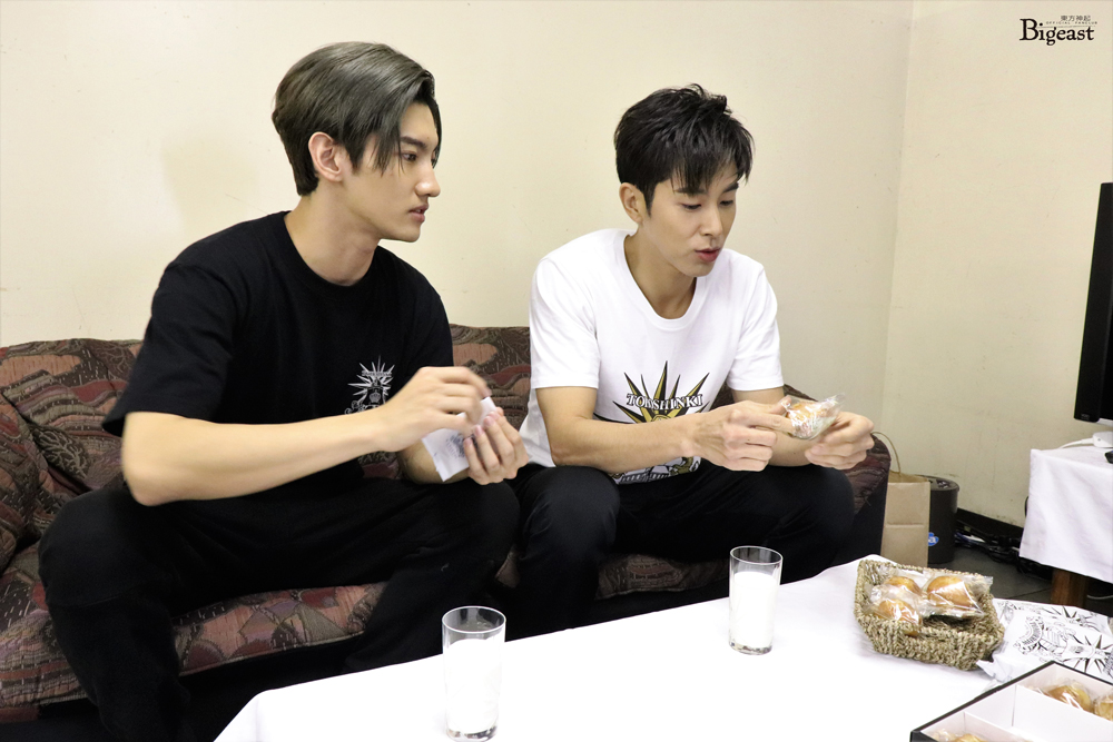 Tohoshinki backstage after rehearsals trying out some of the 「東方神起 LIVE TOUR 2018 ~TOMORROW~」x Sapporo collaboration products such as 「東方神起 ツアー2018 Miso Ramen」, 「東方神起 ライブツアー2018 Kangetsu Koshian」, and 「東方神起 LIVE TOUR 2018 〈Snaffle’s〉Bon Appétit」.