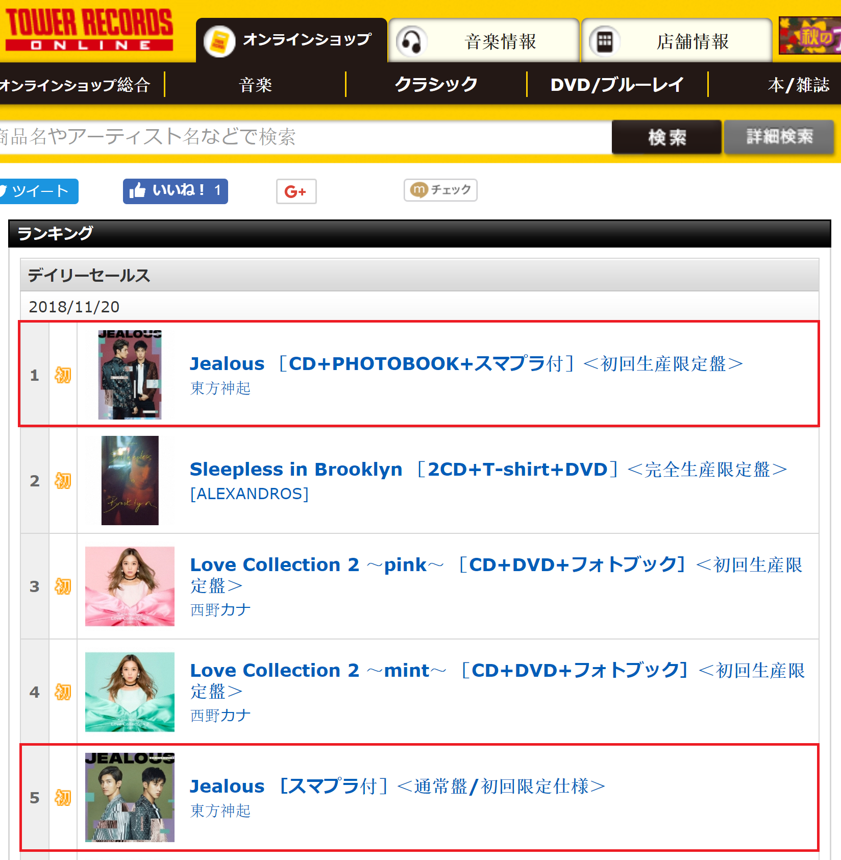 Tower Records Daily Sales ranking for 181120 :