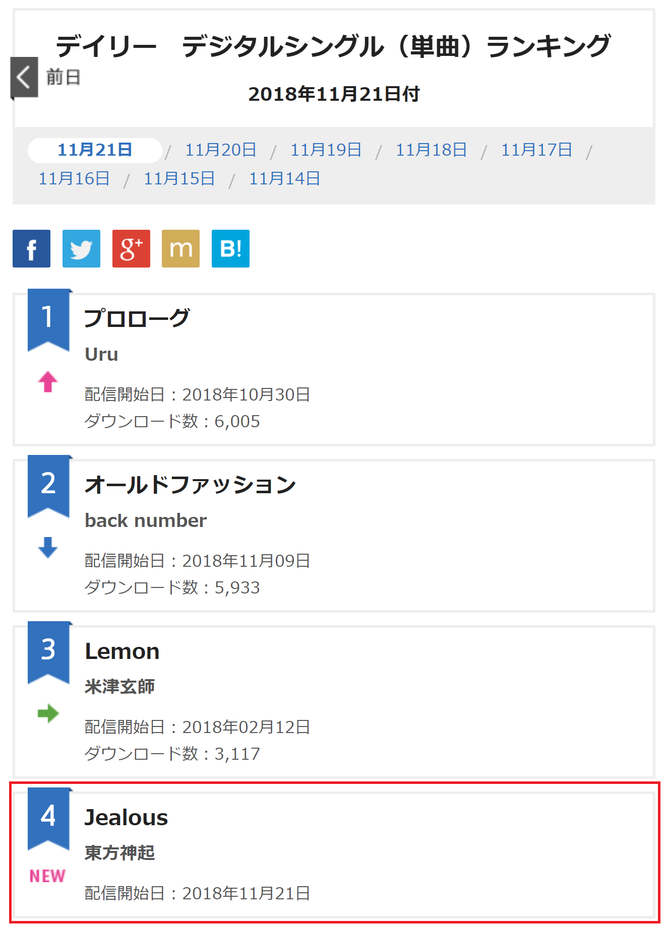 [INFO] 181122 Oricon Daily Single Physical and Digital Ranking (for 181121): No.4 #東方神起 – #Jealous Posted by TVXQ! Express 0 Physical chart: 181122 Oricon Daily Single Ranking (for 181121): No.4 Tohoshinki – Jealous Digital chart: 181122 Oricon Daily Digital Single Song Ranking (for 181121): No.4 Tohoshinki – Jealous —————— Credits: Oricon: 1 and 2, Posted and Shared by TVXQ! Express Share this: Click to share on X (Opens in new window) X Click to share on Facebook (Opens in new window) Facebook Click to share on Tumblr (Opens in new window) Tumblr Like Loading... Related