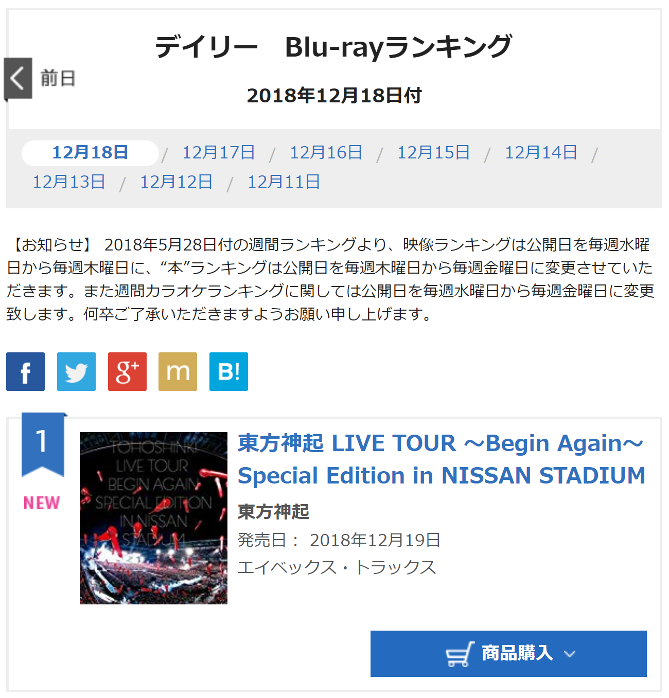 - Oricon Daily Overall Blu-ray chart for 181218: No.1 東方神起 LIVE TOUR ~Begin Again~ Special Edition in NISSAN STADIUM