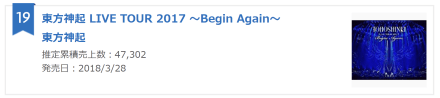 No. 19 東方神起 LIVE TOUR 2017 ~Begin Again~ with 47,302 copies!