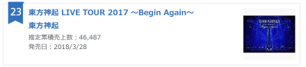 No. 23 東方神起 LIVE TOUR 2017 ~Begin Again~ with 46,487 copies!