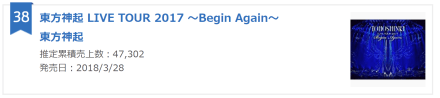 No. 38 東方神起 LIVE TOUR 2017 ~Begin Again~ with 47,302 copies!