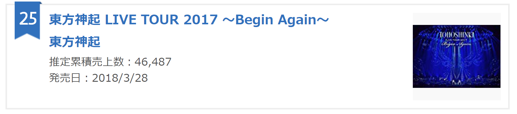 No. 25 東方神起 LIVE TOUR 2017 ~Begin Again~ with 46,487 copies!