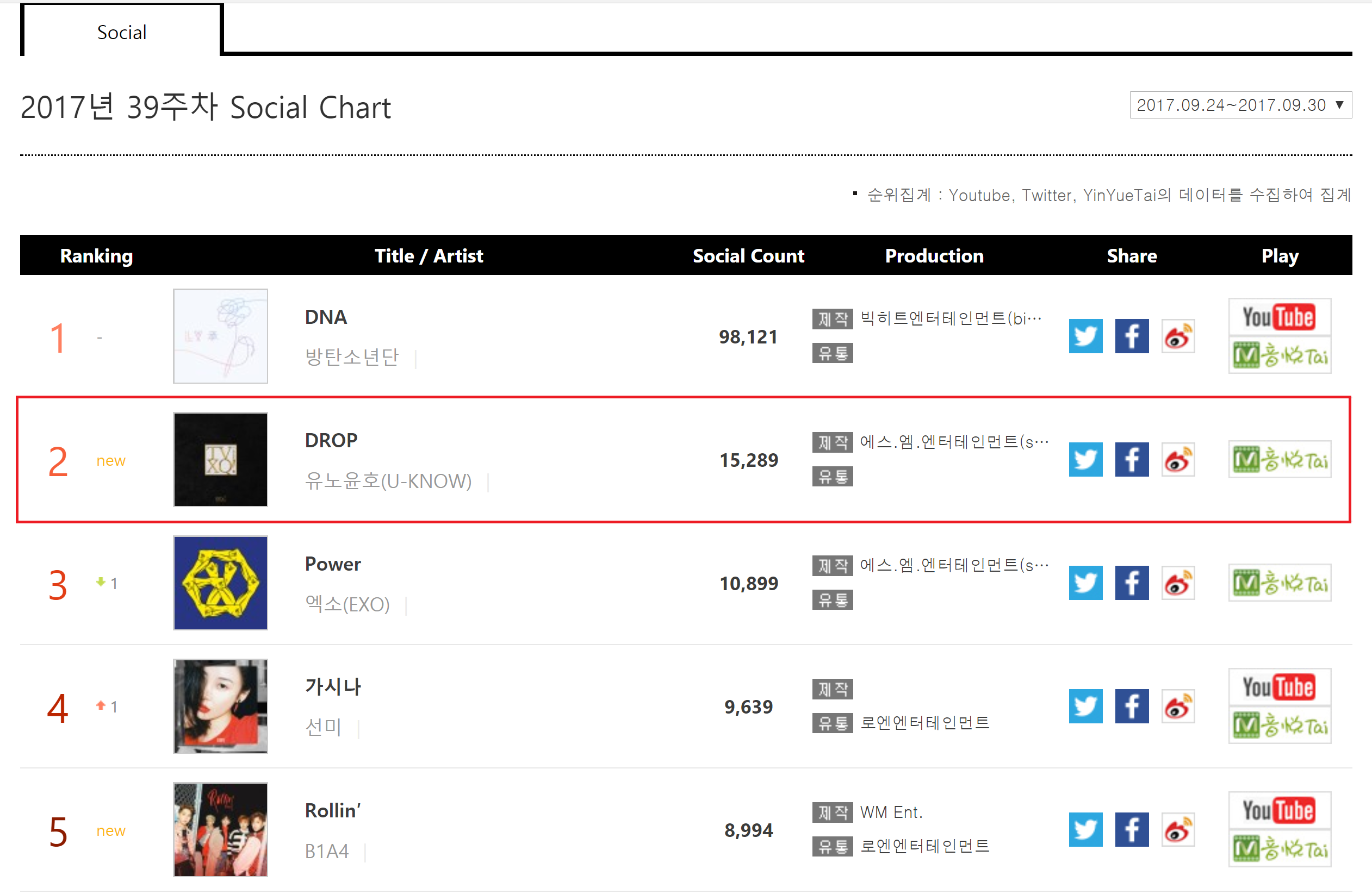 Yunho’s Drop charted as No.2 on Gaon Social Chart for Week 9/24-30!