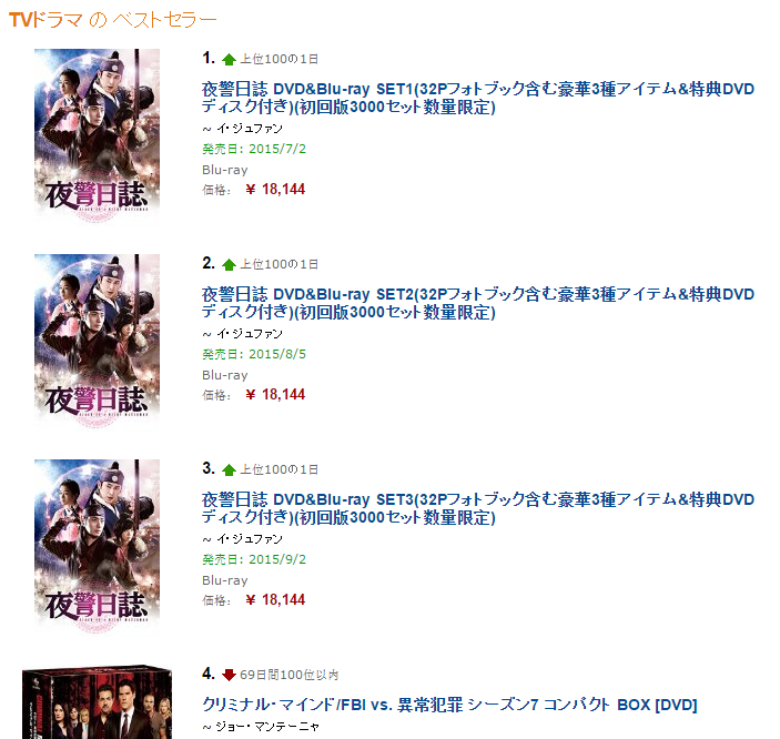 Pre orders of “The Night Watchman Journal” DVD & Blu-ray’s three sets first press copies made the DVDs take over the top spots in Amazon.jp real time (TV Drama, of all kinds) Best Sellers Ranking, still in the chart as of now.