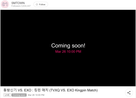 Titled: TVXQ VS. EXO Kingpin Match V LIVE, broadcast at 10PM (KST) on 3/26!