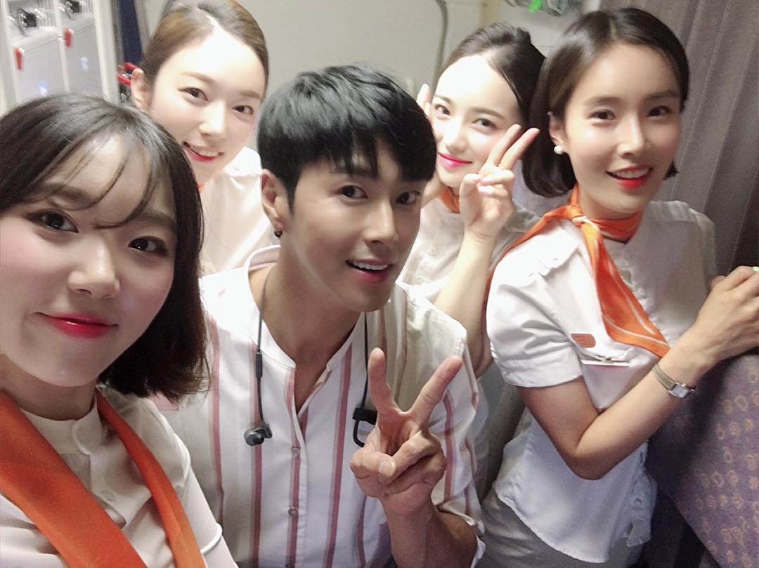 Yunho flied with JEJUair and took a selfie with the flight attendants crew on board~ ^^