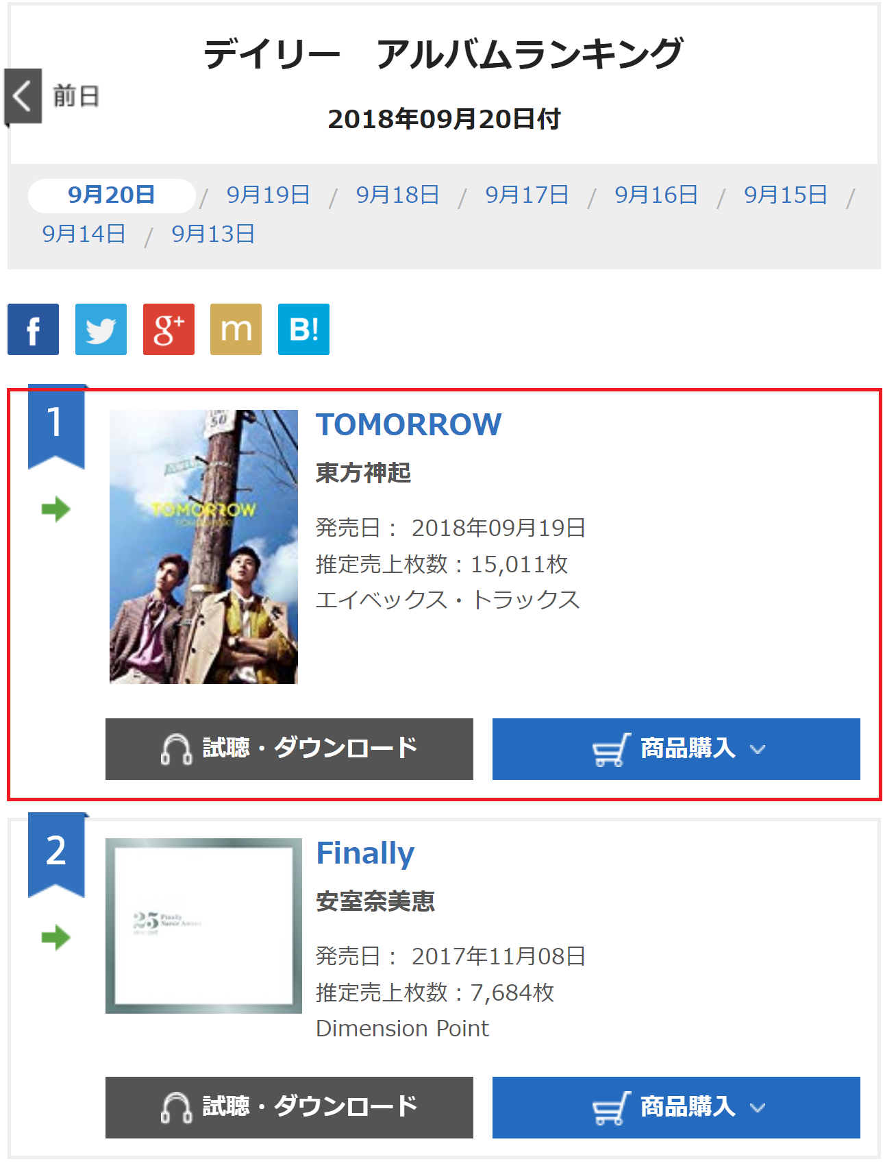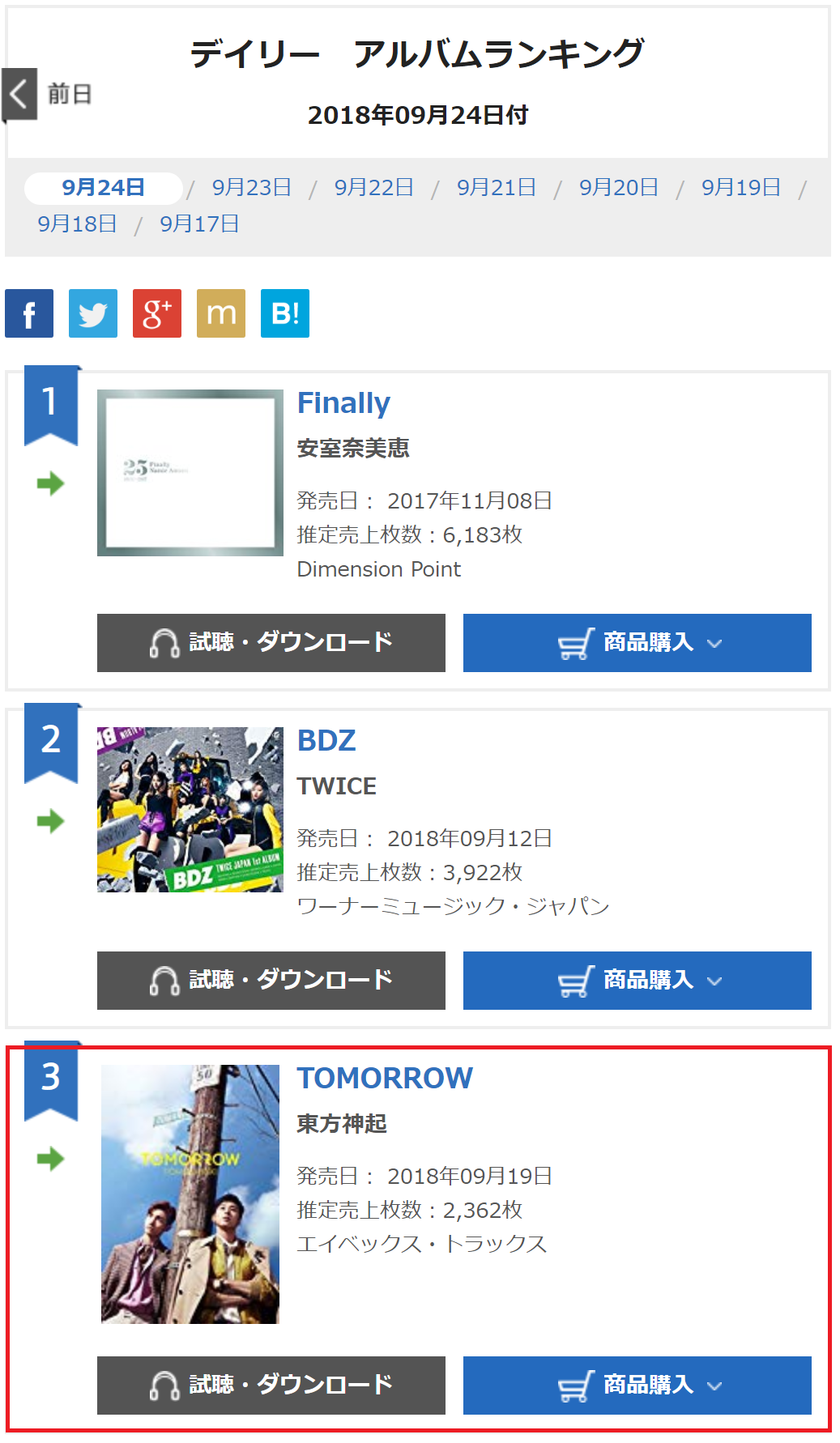 - 180925 Oricon Daily Album Ranking (for 180924): No.3 Tohoshinki – TOMORROW, with 2,362 Copies, Total 127,651 Copies!