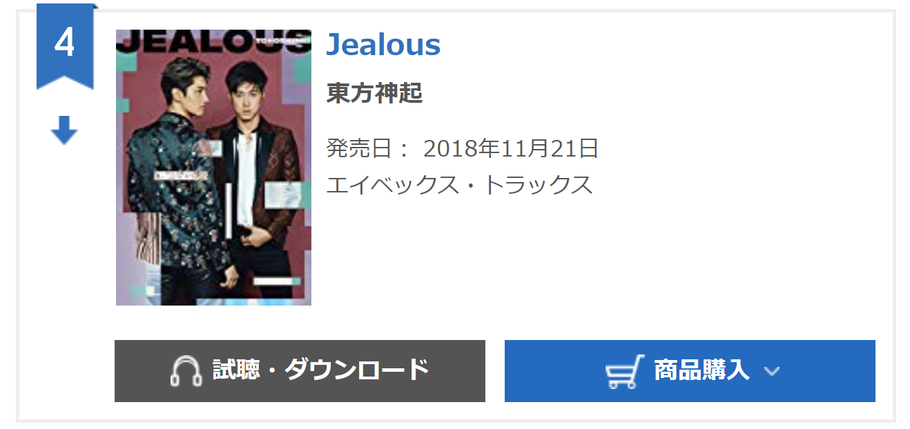 Billboard Japan announced that Tohoshinki single Jealous was No.1 in their top single weekly sales chart for 11/19~25. The single (officially released on 11/21) sold 76,442 copies in the first three days, adding about 12,000 more copies by 11/25 to make up a total of 88,955 copies.
