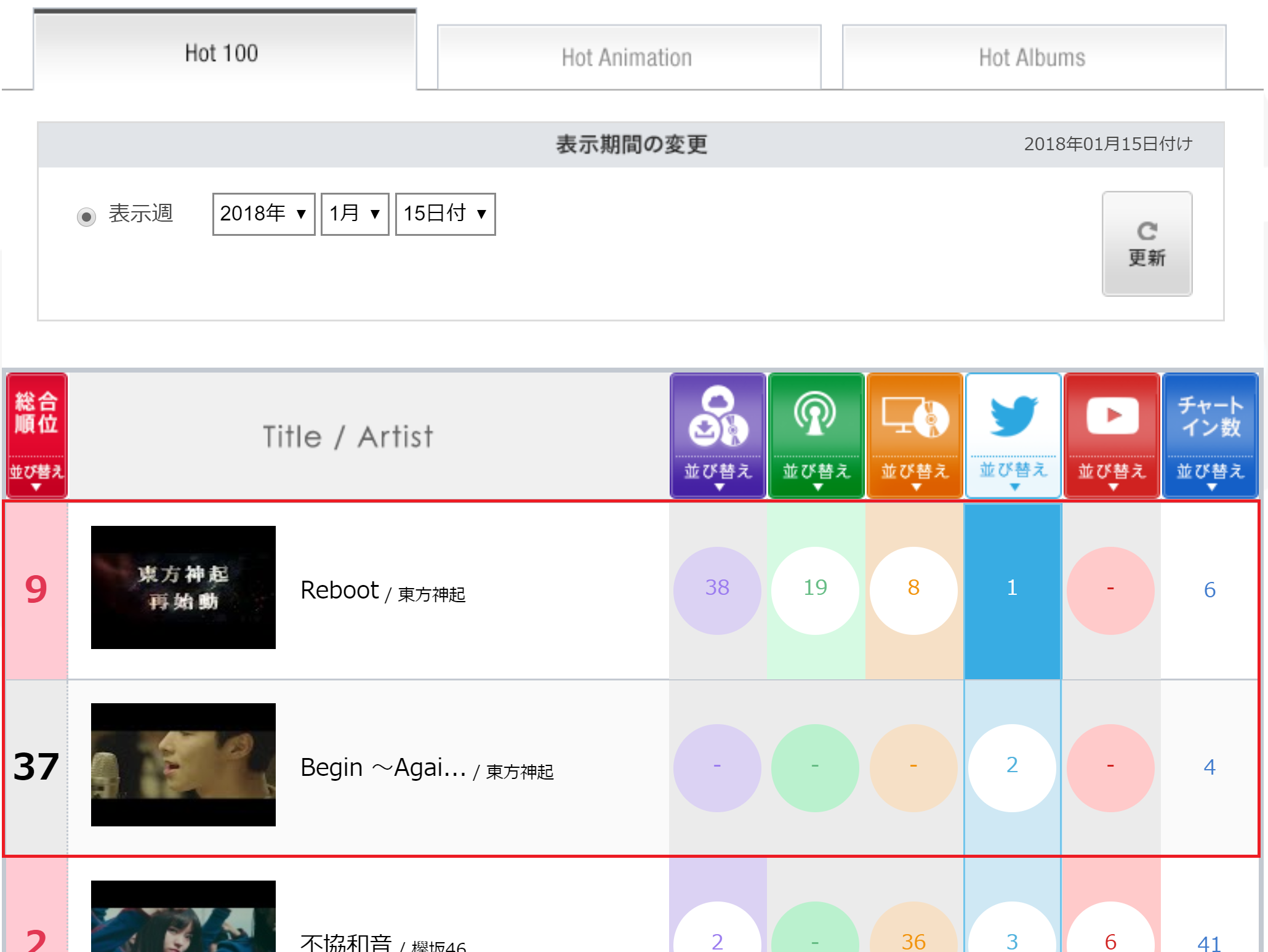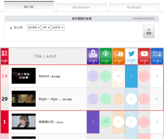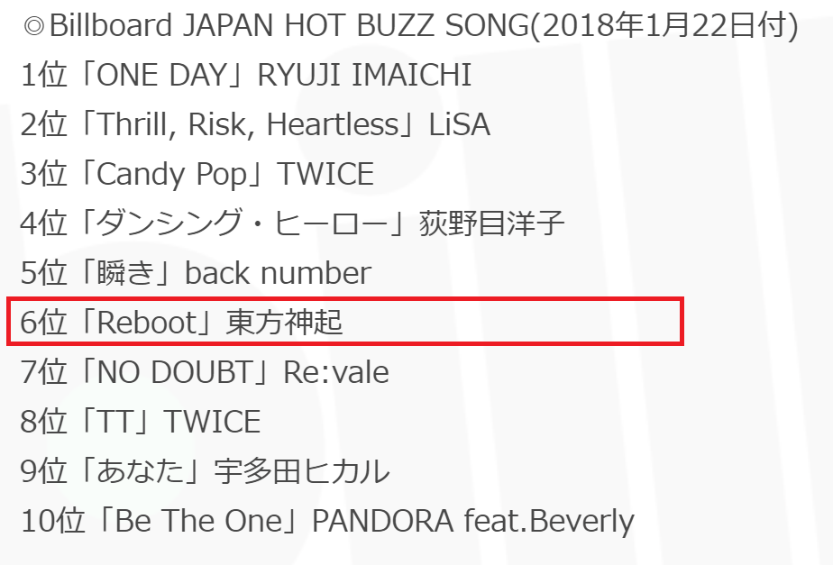 For the week of 2018/1/15, 東方神起 Reboot and Begin topped the Billboard Japan Hot 100 Twitter ranking on the 3rd week since release as well ^^*, with Reboot ranking in Top 10 for Hot 100 overall, and the Reboot single on No.13 for Billboard Japan Weekly Top Singles Sales.