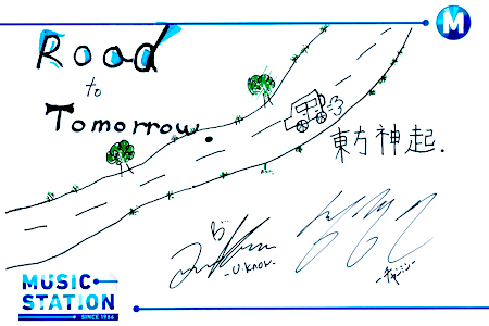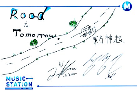 Tohoshinki’s signed drawing for 『After Music Station』(180720) , an illustration of a car in a road with to trees: “Road to Tomorrow.” > w <