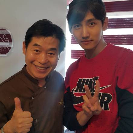 Changmin with his trainer Nae Jongseok’s girlfriend, it looks like the three are hanging out. Just as usual when taking selfies, considerate Changmin pushes his face close to the camera so the others don’t worry about their face size, and she referred to that~ ^^