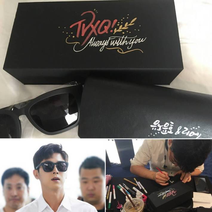 Oeil first artiste collaboration with TVXQ (Yunho wore the TVXQ logo sunglasses on 6/19 to Jeju)